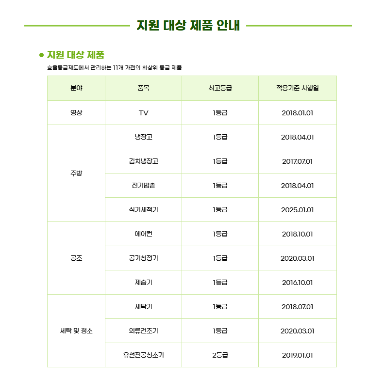 | 지원 대상 | 고효율 1등급(일부 2등급) 가전 11종 |