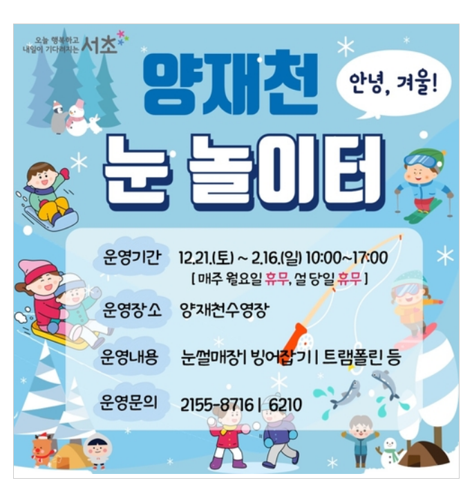 ✅ 양재천눈썰매개장 = 2025.12.20 ~ 2026.02.22 / 10:00~17:00 / 양재천수영장(양재동 126-1)