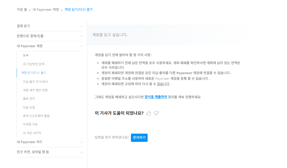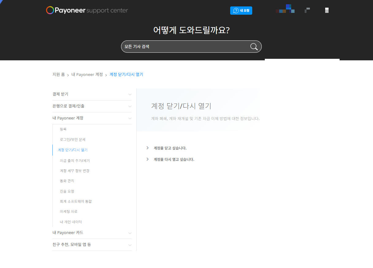 고객센터 페이지 안에서 ‘계정 폐쇄 / 재개설 문의’ 항목을 선택합니다.