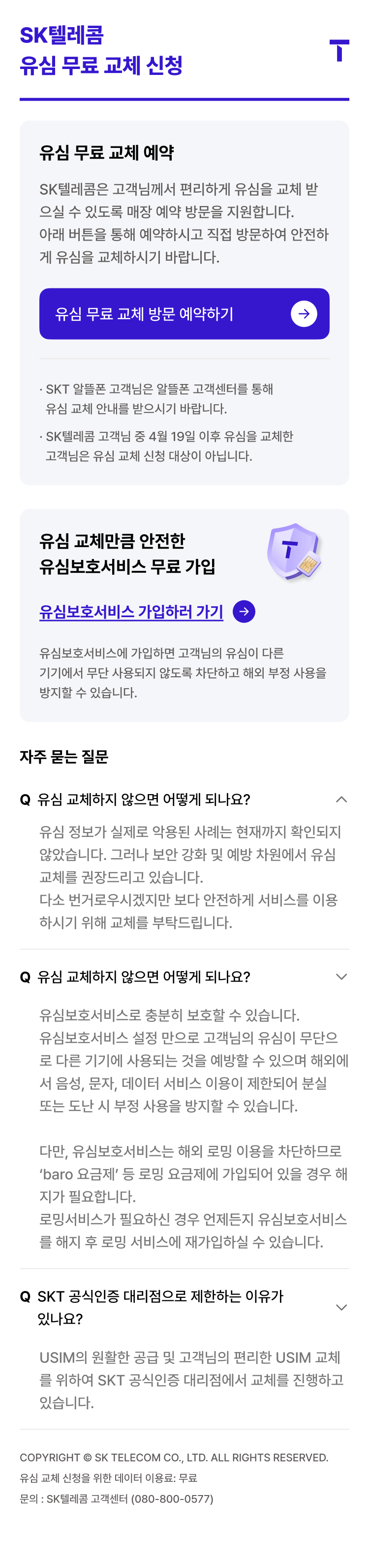 작은 준비가 큰 차이를 만듭니다. 오늘 바로 유심 무료 교체 예약하고, 개인정보를 안전하게 지켜주세요!
